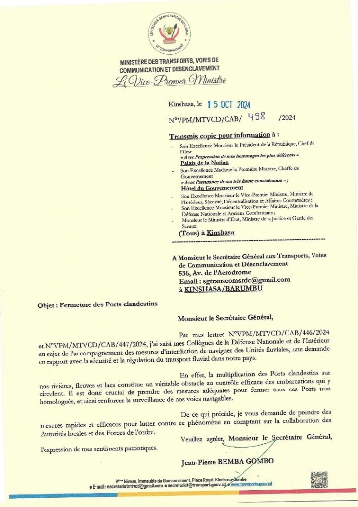 RDC/Transports : Le Secrétaire Général aux Transports Prié de Fermer les Ports Clandestins