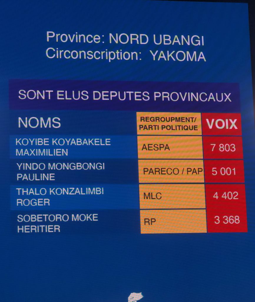 Et la députation provinciale les élus sont: KOYIBE Koyabakele maximilien (AESPA), YINDO Mongbongi Pauline (Pareco/Pap), THALO Konzalimbi Roger (MLC) et SOBETORO Moke Héritier (RP).