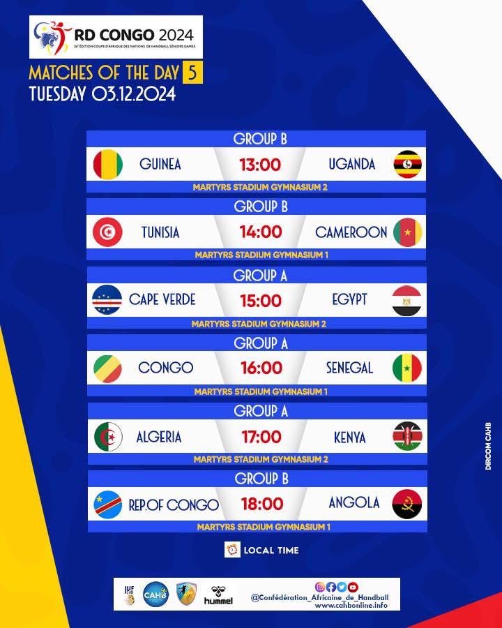 CAN HANDBALL SENIORS DAMES RDC 2024 : 5e ET DERRIÈRE JOURNÉE DU PREMIER TOUR DE LA 26e ÉDITION DE LA COUPE D’AFRIQUE DES NATIONS DE HANDBALL SENIORS DAMES 2024