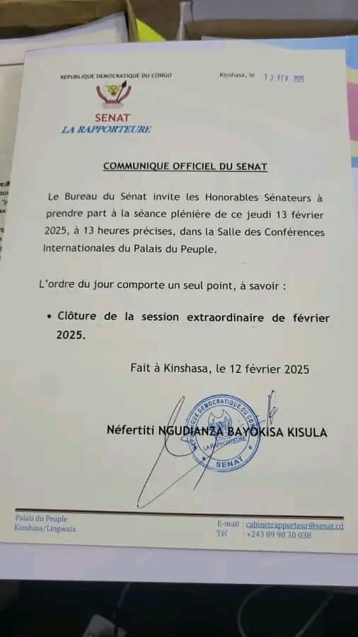 D’après un communiqué de la chambre haute du parlement, le jeudi 13 février 2025, le Sénat accueillera une session extraordinaire dédiée à l’agression rwandaise. Cette réunion vise à examiner les conséquences de ce conflit sur la région des Grands Lacs et à réfléchir aux implications historiques et contemporaines de cette agression.