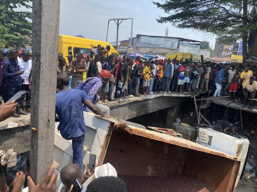 Un temoin oculaire de l’événement ayant requis l’anonymat raconte les faits: « Ce camion à benne basculante transportant des caillasses venait de l’avenue kabambare. il devait livrer les caillasses dans une maison mais s’est trompé de chemin. le chauffeur, dirigé par son convoyeur a tenté une manœuvre sur le pont pour rebrousser chemin. le pneu arrière du véhicule a roulé sur le passage piéton du pont. n’étant pas résistant il a cédé entrainant la chute du véhicule dans le canal. le conducteur est rapidement sorti mais avec des sérieuses blessures sur la tête. il a été conduit à l’hôpital juste à côté pour des soins ». a-t-il