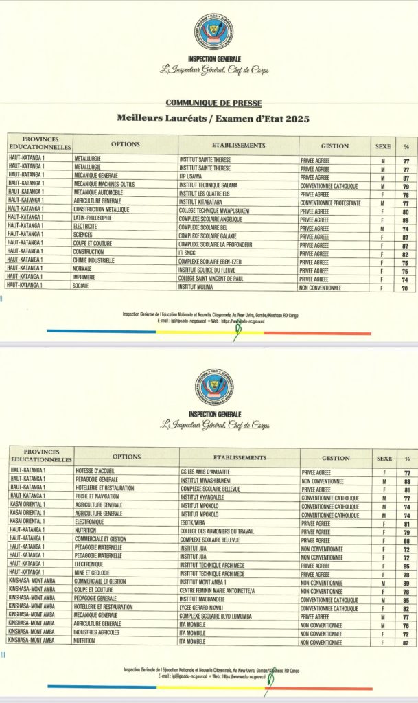 Le Ministère de l’Éducation Nationale et Nouvelle Citoyenneté a publié ce dimanche 03 Août 2025, les premiers résultats de la 58ᵉ édition de l’Examen d’État, concernant exclusivement les provinces éducationnelles Kasaï-Oriental 1, Haut-Katanga 1  et Kinshasa Mont-Amba.