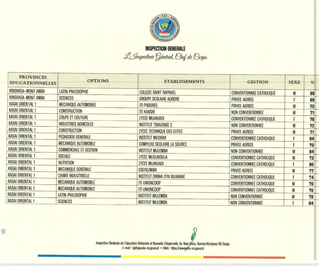 À Kinshasa, trois écoles se sont particulièrement distinguées : le Groupe scolaire Aurore, l’institut Mont Amba 1 et le Collège Saint Raphaël, qui comptent chacune un lauréats avec 89%.