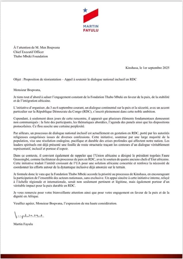 cette demande intervient alors qu’un dialogue continental sur la paix et la sécurité, avec un accent particulier sur la situation en RDC, est convoqué en Afrique du Sud, du 3 au 6 septembre 2025 par la Fondation Thabo Mbeki.