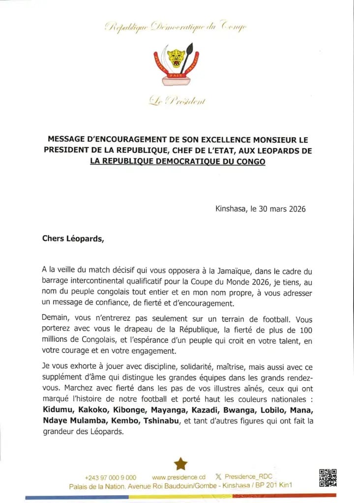 Alors que la ferveur monte dans les rues de Kinshasa et partout en province, cet appel à la mobilisation générale transforme cette rencontre en une véritable affaire d’État. Face à la Jamaïque, les Léopards savent désormais qu’ils ont rendez-vous avec leur destin… et celui de 100 millions de Congolais.