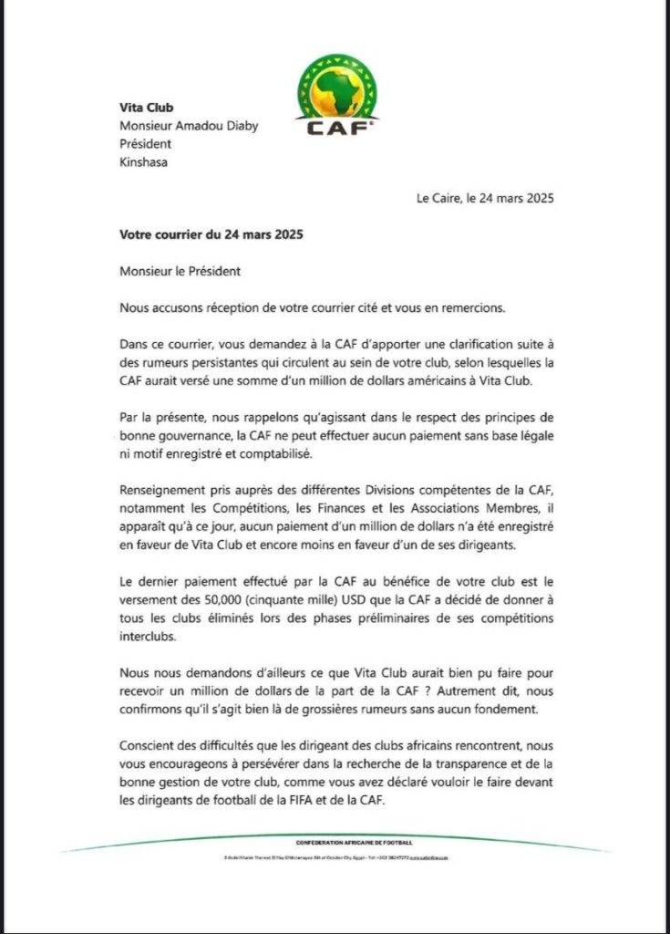 Paiement d’un million de dollars à l’As Vita Club: la CAF dément
