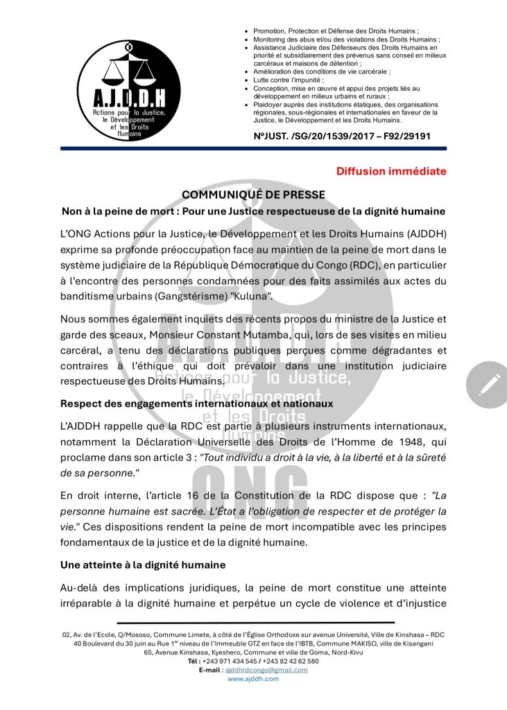 JUSTICE: L’AJDDH préoccupée par le maintien de la peine de mort en RDC